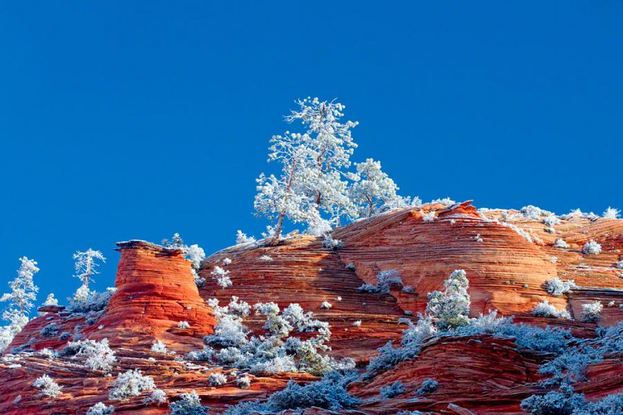 La plupart des gens qui visitent le parc national de Zion viennent dans les mois les plus chauds, quand Zion Canyon peut être carrément grésillement. Mais en hiver, la substance blanche saupoudre les altitudes plus élevées dans le parc de temps en temps. En janvier 2016, une tempête de neige rare a recouvert les passages inférieurs du parc, qui se trouve au bord du désert de Mojave. Nous voulons savoir comment les rangers du parc ont résisté à l'envie de mettre quelques ornements sur ce pin enneigé.