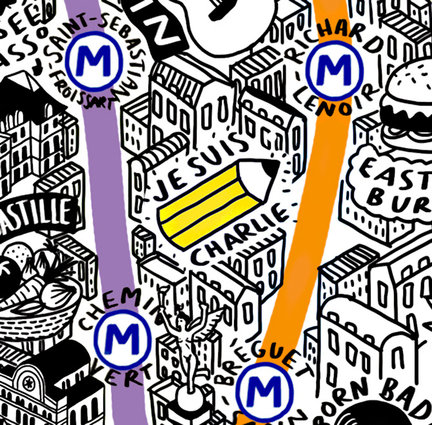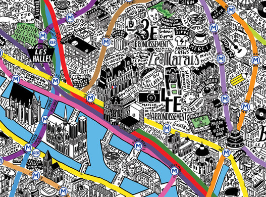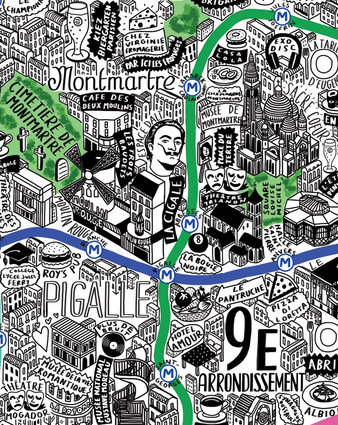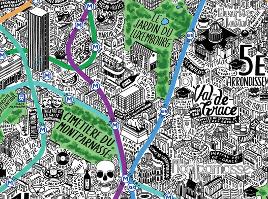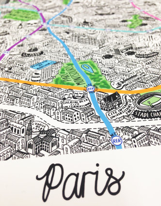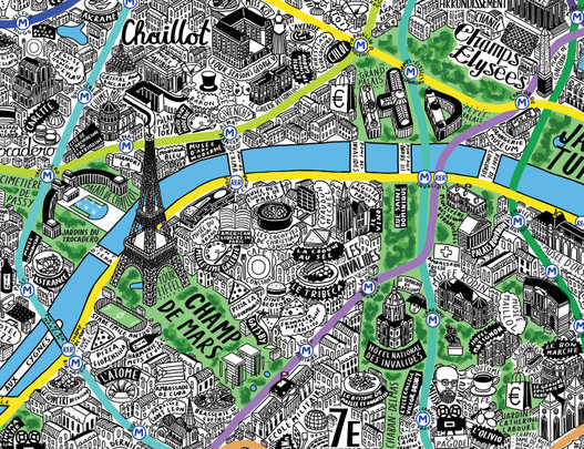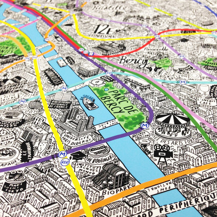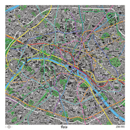 En collaboration avec le site Evermade, l'artiste britannique JENNI SPARKS a aussi revisité la carte de Paris. Elle y a représenté ses lignes de métros, les noms des rues principales, les différents arrondissements et les monuments phares, mais pas que... Plusieurs lieux-dits, commerces ou restaurants populaires sont aussi présents, une bonne façon pour son propriétaire de (re)découvrir la capitale.
