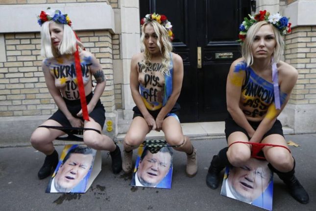 Culotte baissée, des couronnes de fleurs dans les cheveux, elles ont longuement uriné sur des photos du chef de l’Etat, au cri de «l’Ukraine en Europe», avant de se rhabiller et de quitter les lieux sans incident. Il n’était toutefois pas clair si elles ont toutes réellement uriné ou si certaines ont simulé le geste à l’aide de poches contenant du liquide.