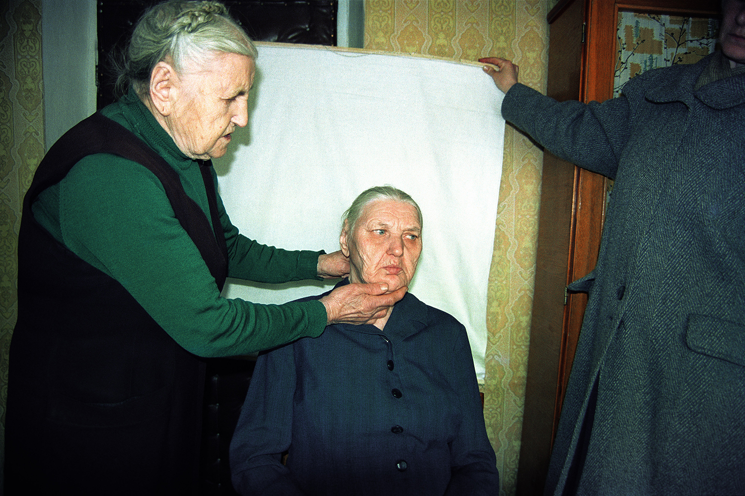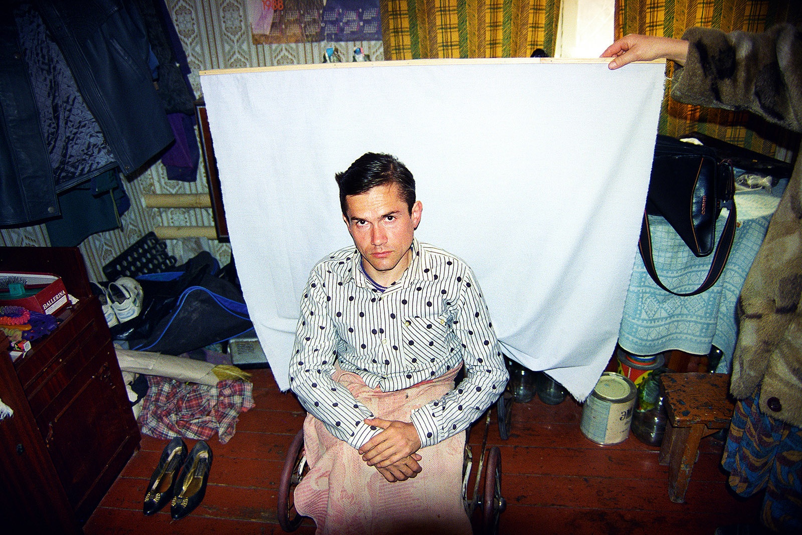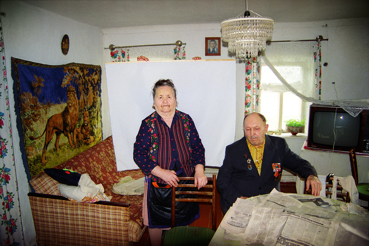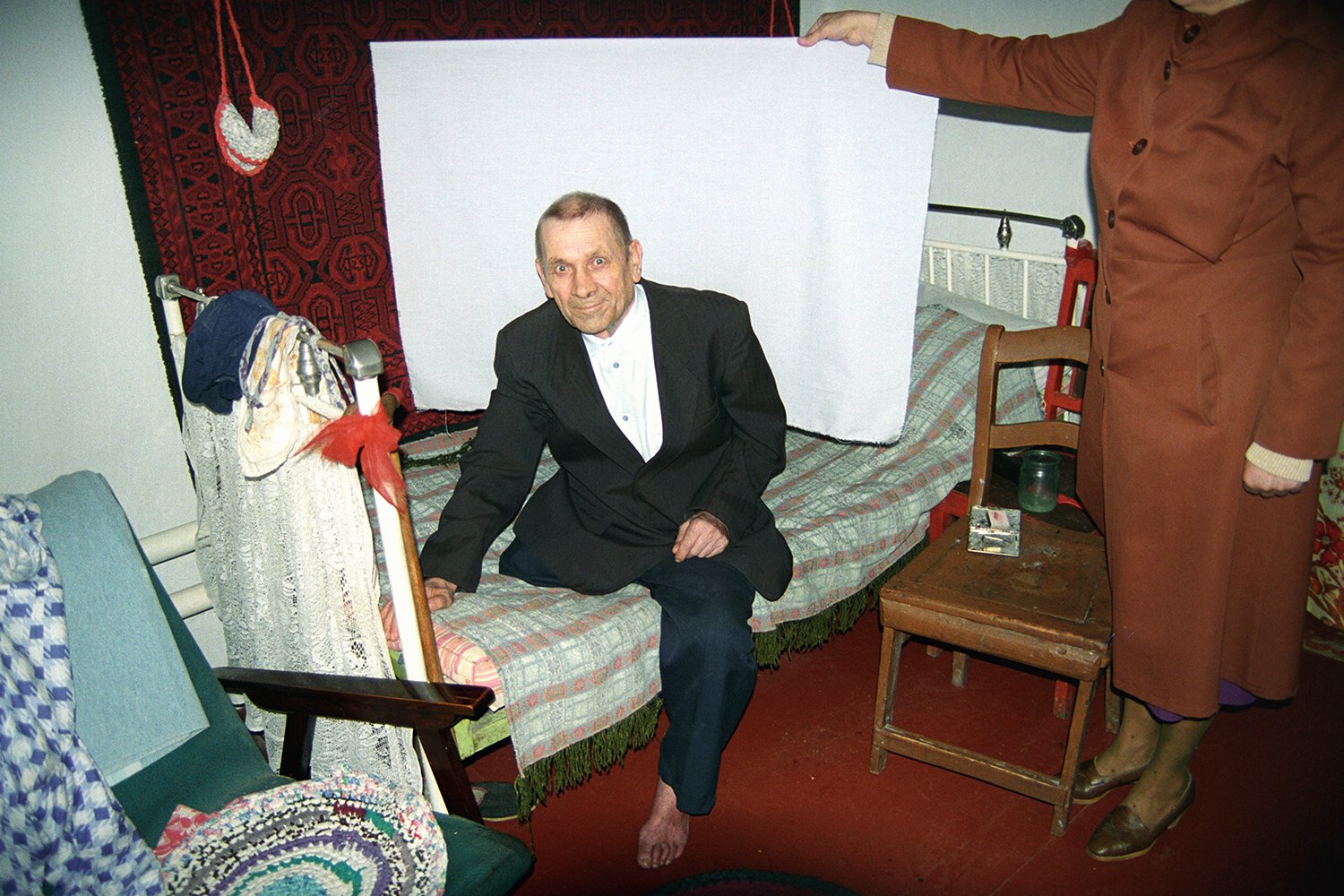 Alexander Chekmenev était un de ces photographes, en plus des photos d’identité, il a réalisé des clichés au cadrage plus large, qui montre les intérieurs des logements avec des proches qui tiennent le fond blanc derrière le sujet.